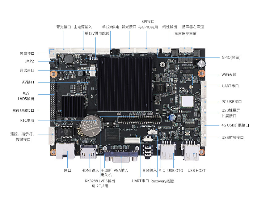 注:USB默認(rèn)HOST,其中一路Type-A支持OTG,一路PH2.0和4G模塊共用 ,一路觸摸框切換