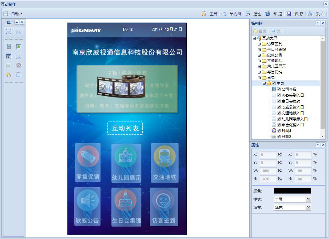 互動制作主界面中可以看出,左側為可以添加的素材,右側為整個節目的結構樹和每項區域中素材的屬性設置。在該節目的首頁中,添加了背景圖片、時間、日期、視頻區域和六個跳轉按鈕。