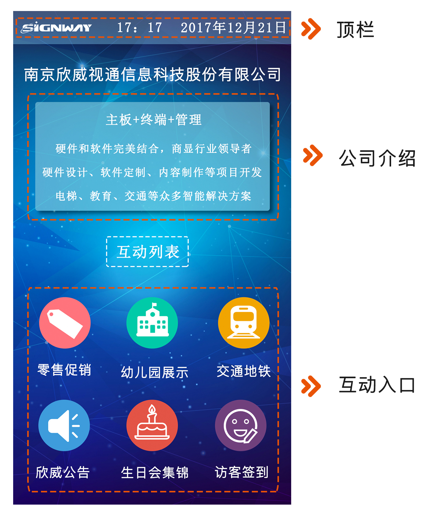 我們以欣威視通的行業解決方案互動節目為例,整個界面中有三個部分:頂欄(logo、時間、日期)、公司介紹和互動入口。這邊的每一個互動入口都可以點擊進入到詳細的互動界面。